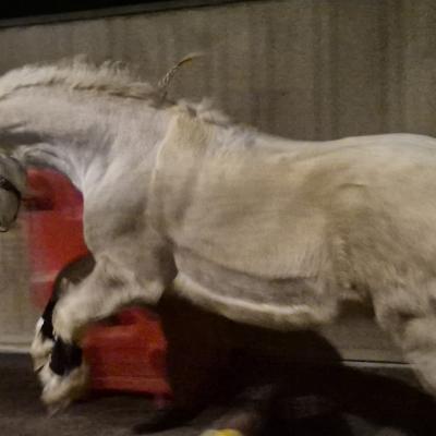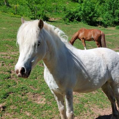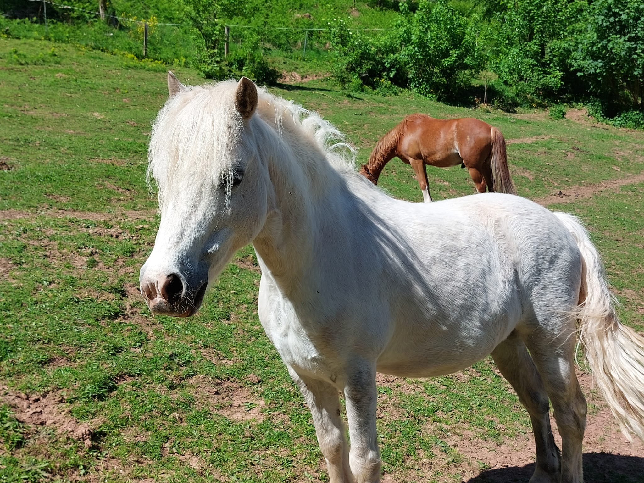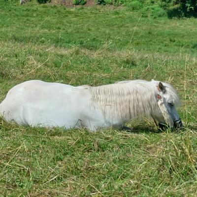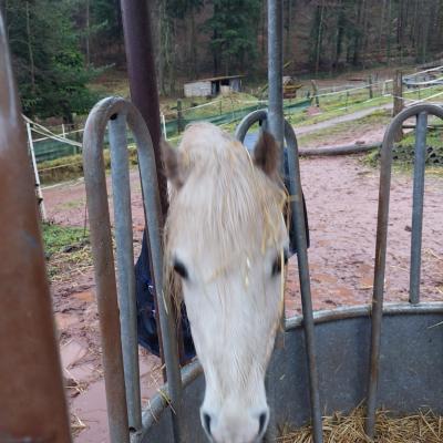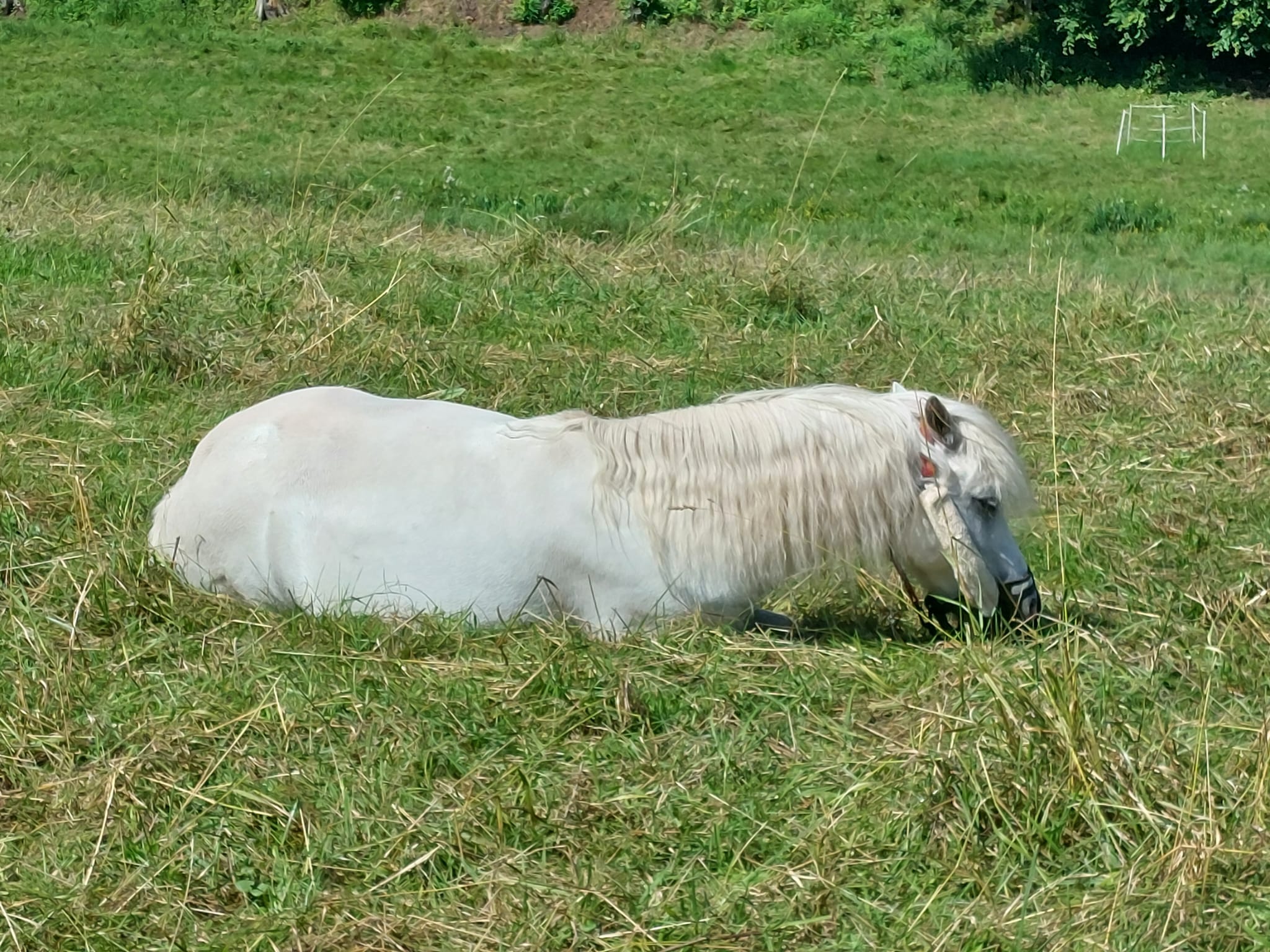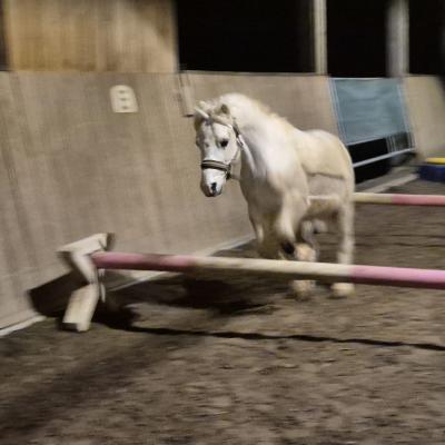 Das ist Bijou, eigentlich heißt er Reke – aber alle nennen ihn Bijou. Er ist ein Welsh-A-Wallach mit einem hellen Schimmelfell.