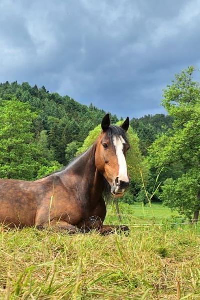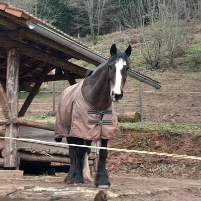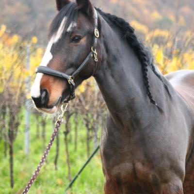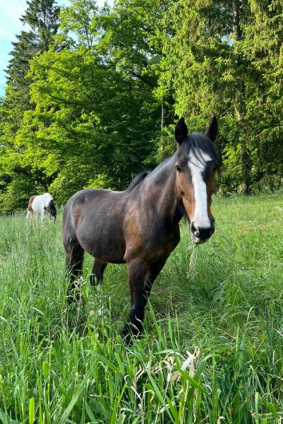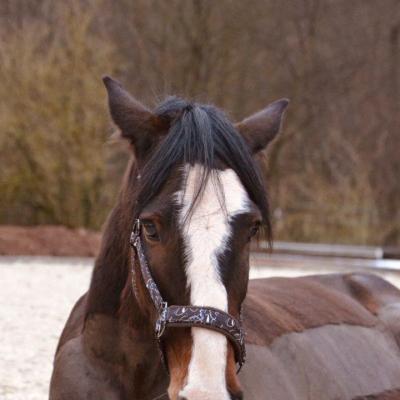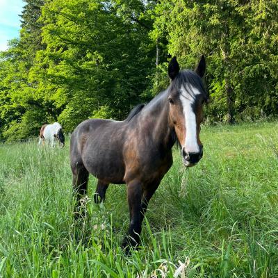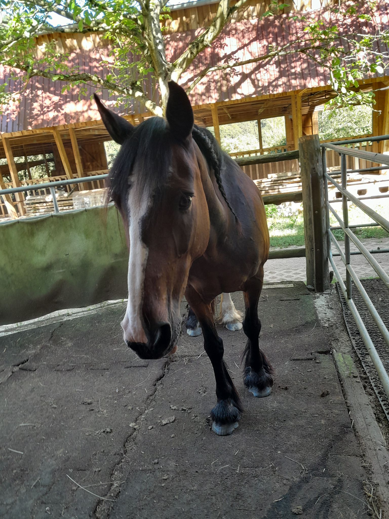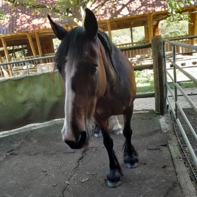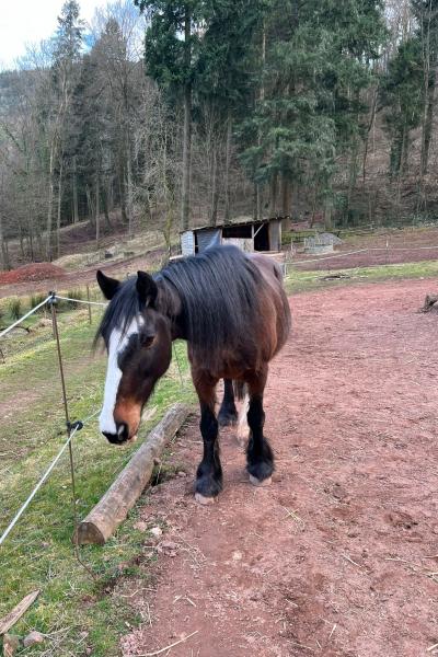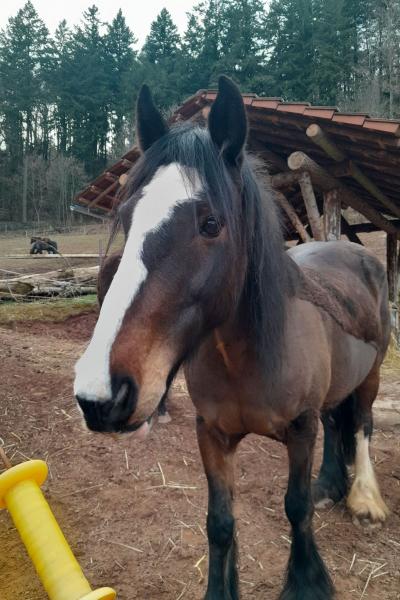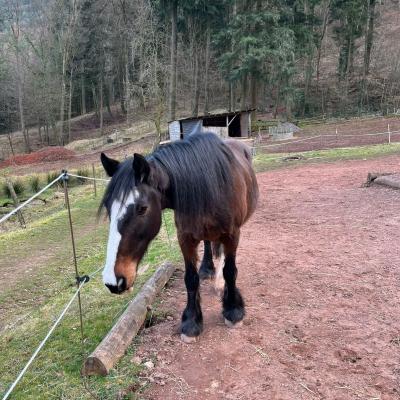 Das ist Brandy. Er ist ein Tinker-Mix, 15 Jahre alt, hat ein braunes Fell und ist ein Wallach.