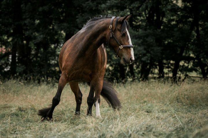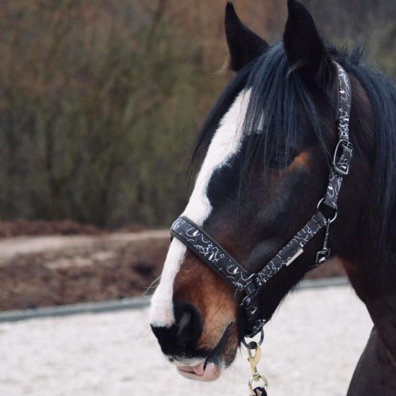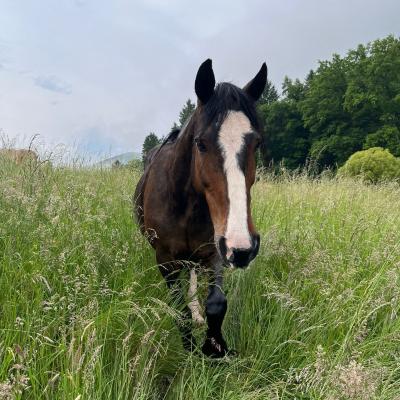 Unverwechselbar macht ihn seine breite Blesse und der schwarze Fleck an seiner Schnauze.